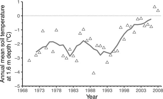 Temporal variation in observed annual mean soil temperature at site 25,206 from 1969 to 2008. Gray line denotes five years’ running mean.
