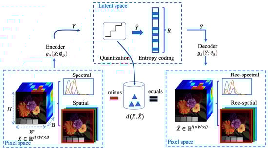 Different from the universal RGB images, hyperspectral images (HSIs) characterize each pixel of the observed materials with a unique spectral signature that is composed of dozens or even hundreds of components corresponding to different wavelengths []. This provides a much finer knowledge of the scenes, making HSIs advantageous and crucial tools for some computer vision tasks, such as object categorization [,], recognition [] and restoration []. However, the benefits of the additional information also pose challenges for the HSI sensor storage capacity and the attainable transmission bandwidth. Therefore, an effective compression technology is vital for HSI processing tasks.