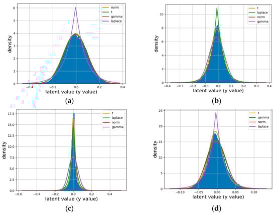 Different distributions (Gaussian (also called norm) and Student’s T (also simplified to t)) fitted to empirical histograms (blue blocks). The best distribution plot is described with the orange line. (a) Kodak, (b) CAVE, (c) KAIST, (d) Pavia _ U.