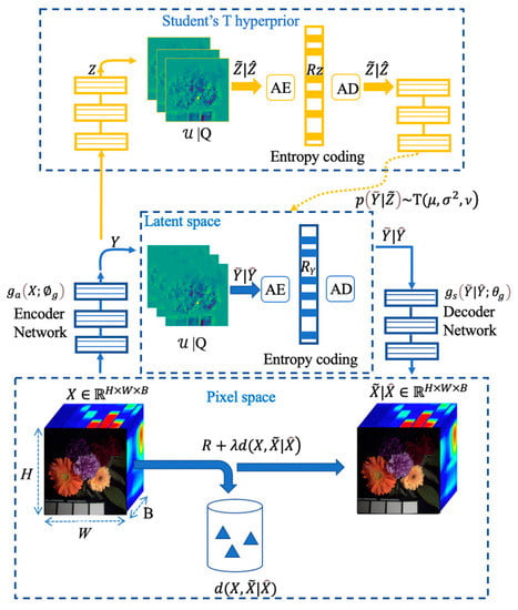 An end-to-end HSI compression model with the Student’s T hyperprior. |Q corresponds to either additive uniform noise employed during training (yielding vectors signed with a tilde) or rounding during testing (yielding vectors signed with a hat). The architecture of the hyperprior is identical to [], except that we use a Student’s T likelihood. The details of and are specified in Section 3.3.