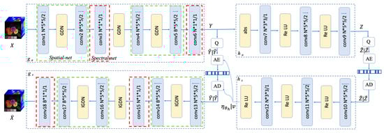 In order to fully exploit the spatial and spectral correlation, the design of and networks should take the anisotropic characteristic of HSIs into consideration. We design our spatial network (the spatial net circled with a green box in Figure 5) and spectral network (the spectral net circled with a red box in Figure 5) separately. There are two convolutional layers in the spatial network connected with GDN or IGDN. The first layer employs N/B filters with a size of and down-sampling/up-sampling with a factor of 2, where B equals the number of spectral bands of HSIs, and N is the number of the filters. The number of output channels of the last layer of the primary encoder is the bottleneck, which determines the components that should be stored. The spectral network employs N/B filters with a size of . Note that the output channels of the final layer of the primary decoder must be consistent with the band numbers of HSIs to generate identical spectral resolution. The details of hyperparameters can be found in Appendix A.