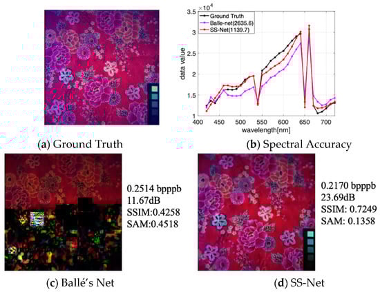 One of the key points of the proposed HSI compression model is the SS-Net, which can be more efficient and robust for spatial and spectral feature extraction, particularly for scenes involving rich texture details. If we just consider the spatial transform (e. g. Ballé’s Net []), we may miss some data of HSIs in training, therefore reducing the performance for certain HSIs. Figure 7 shows this problem. There are some data and noise missing in Figure 7c, while the entire spatial information can be reserved in Figure 7d with SS-Net. Both PSNR and SSIM increase by approximately 50%. The SAM reduces by approximately 30%, and the reconstructed spectrum is closer to the ground truth (the red plot (SS-Net) is closer to the black plot in Figure 7b (ground truth represents the original HSI)). Moreover, when the Lagrange multiplier is set to the same value, SS-Net can achieve a smaller bpppb. Note that the experiments are implemented with the Gaussian prior in the hyperprior.