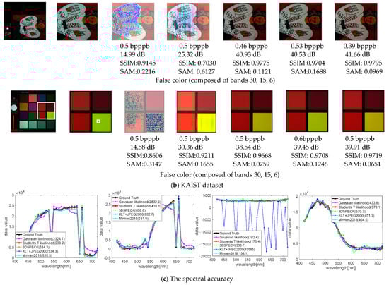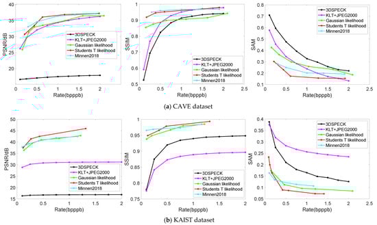 First, to illustrate the advantage of the proposed spatial and spectral network for the HSI compression task, we compare with [] by keeping the entropy model identical. Then, we demonstrate the superiority of Student’s T prior for HSI compression from the spatial and spectral aspects. To further verify the effectiveness of this learned hyperspectral compression approach, we compare it with two representative linear transform coding based HSI compression methods, namely KLT + JPEG2000 [] and the 3D version set partitioned embedded block (3D SPECK) [] and a state-of-the-art learned model []. For the KLT + JPEG2000 method, a KLT transform is first applied to the spectral dimension, and then JPEG2000 is applied in the spatial domain. Note that JPEG2000 is carried out with Kakadu version 8.0.5 in this paper. For 3D SPECK, the main idea is to employ a 3D DWT to HSIs and then provide a sequence for significant pixels with a block splitting algorithm. Note that 3D SPECK is implemented with QccPack in our experiments. For the learned model [], we use the open sources provided by the authors.