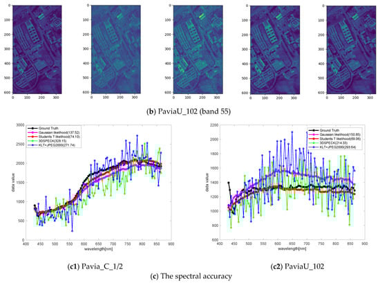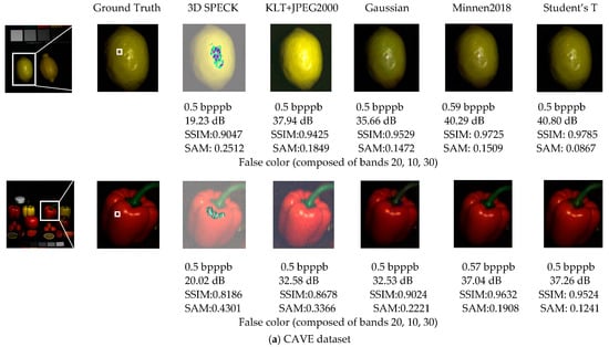 In addition, the average rate-distortion performance for CAVE and KAIST datasets are shown in Figure 8 and Figure 9, where Figure 8 describes the rate-distortion curves and Figure 9 shows the reconstructed visualization of the individual HSIs. For ROSIS-Pavia, we find that a large number of bands reduces the training speed. Therefore, we just train four separate models, two relatively low bit rates and two relatively high bit rates, where two models are based on the Gaussian prior and two models are based on the Student’s T prior. The rate-distortion results are shown in Table 2 and Table 3, where Table 2 corresponds to a low bit rate and Table 3 corresponds to a high bit rate. Figure 10 shows the reconstructed visualization of the individual HSIs at low bit rates (the quantitative results are shown in Table 2).
