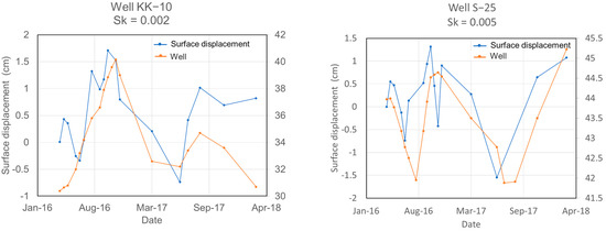 The skeletal storage coefficient, Sk, of a confined aquifer (also called storativity) is a dimensionless measure of the volume of water released from or taken into storage per unit surface area of the aquifer per unit change in the hydraulic head [65]. It is defined as Sk = Ss∙b, where Ss is specific storage (L−1), and b is the thickness (L) of the aquifer. We estimated the Sk of the confined aquifer system from 2016 to 2018 using the following relationship with surface displacement (Δb, from PSI) and the change in the hydraulic head (Δh) at the 13 well sites [66,67]: