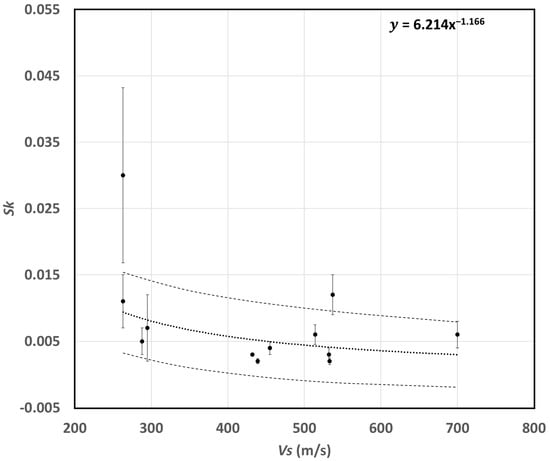 Around 83.3% of data points lie within the ±95% confidence interval of the relationship in Equation (5). The relationship between Sk and Vs can be explained by the relationship between compressibility and stiffness (or Vs), as mentioned in the previous sections.