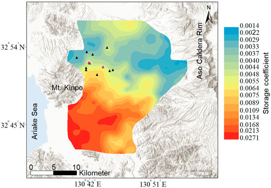 Mapped storage coefficient for the confined aquifer in the study area. Triangles indicate well locations.