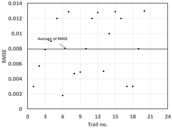 where and are measured and estimated Sk values of the i sampling point, respectively, and N is the total number of observation points. In our case, N corresponds to the number of validation data sets (N = 3). The method is repeated 20 times (trials) to estimate the RMSE of each trial (Figure 10). The low RMSE (averaged RMSE = 8.1 × 10−3) indicates that the constructed equation (i.e., Equation (5)) can estimate Sk values at unmeasured points with a minor error.