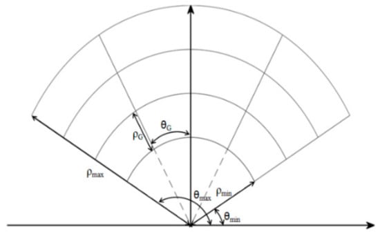 where ρ is the polar radius and θ is the polar angle. Then, points can be divided into polar grids on the x-o-y plane. The bounding box of the polar grid can be determined by the maximum and minimum polar coordinates (ρmin, θmin) and (ρmax, θmax), and the cell size depends on two grid parameters, angular size θG and radial size ρG, as shown in Figure 2. The radial size ρG determines the range of the data in one cell along the direction of the laser beam. The angular size θG is set as an integer multiple of the horizontal angular resolution: