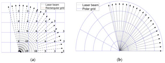 Comparison between a rectangular grid and a polar grid. The number in (a) is the number of laser beams passing through each cell. In (b), different cells in the polar grid correspond to similar number of laser beams. The comparison shows that the polar grid achieves a more even data distribution.