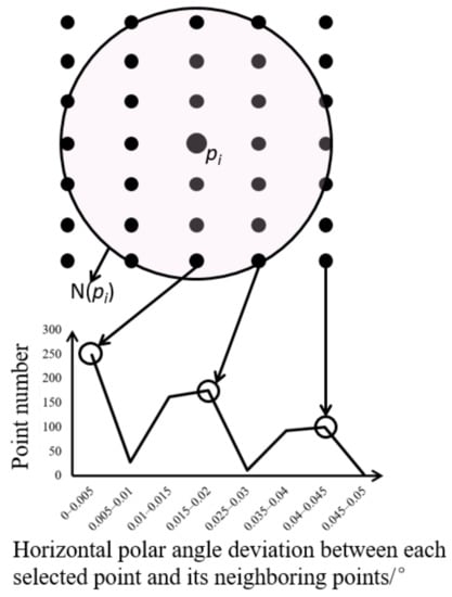 where pi is the i-th picked point and pij is the j-th point in the neighborhood of pi. The horizontal polar angles of pi and pij can be calculated using Equation (1), labeled as θi and θij respectively. Then we calculate the absolute value of the horizontal polar angle deviation between pi and each point in its neighborhood N(pi):