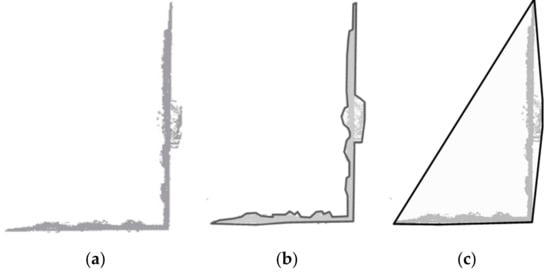 - Horizontal Hollow Ratio. It has been indicated in previous studies that this feature can be utilized for building extraction in ALS [] and MLS [] data. As the laser beam cannot penetrate the facade surface and the roof cells have been filtered utilizing DoPP filtering, the hollow regions also exist behind the facade from the bottom view of the TLS data. In the study of [], the horizontal hollow ratio is calculated as the ratio of projection area to convex hull area: