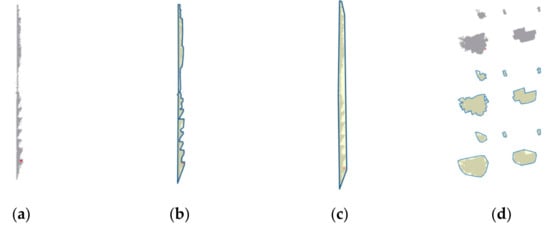 - Compactness. After horizontal hollow ratio filtering, some facades are still mixed with non-building objects, such as trees and pole-like objects. Many of those objects are commonly isolated and the corresponding projections appear as circular shapes, while facades have a long and thin shape. The geometry difference can be measured by compactness [], which is calculated as:
