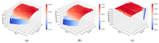 The key parameters for the original DoPP filtering are cell size and the threshold T of the point number used to label a cell as belonging to a building. The size of the rectangular grid is set to (0.1 m, 2 m), with the interval of 0.1 m, and the range of the threshold T is set to (100, 1500), with an interval of 100. Based on the above parameter settings, 300 groups of filtering results can be obtained. In addition, an empirical parameter setting is generated for the original DoPP filtering based on previous studies. The grid size is set as 0.15 m according to the work of []. The T value is set as 80 based on the work of [], this figure having been obtained by calculating the point number when placing the lowest facade in the position of the farthest building.