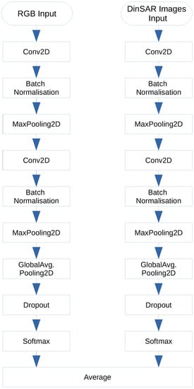 A convolutional neural network (CNN) is an artificial neural network used for computer vision (or object recognition and classification) based on convolutional kernels applied to the input images to create feature maps instead of using feature descriptors []. A two-layer convolutional neural network (ConvNet2) was designed, which consists of two CNNs in parallel, one for the DInSAR processed Sentinel-1 images phase, coherence and displacement maps, and one for the Sentinel-2 optical images, as shown in Figure 1. The design of the CNN is similar to the ResNet convolutional blocks with two convolutional layers that have batch normalization and maximum pooling []. In the first 2D convolutional layer, there are 32 filters. In the second 2D convolutional layer, there are 64 filters. The convolutional layers use a 3 × 3 filter kernel and a ReLU activation function. A 2 × 2 filter kernel is used for maximum pooling. Thereafter, there is a Global Average Pooling layer []. This is followed by a dropout layer to avoid overfitting and to improve the model’s generalization []. The values, (0.2, 0.3, 0.4), are considered as the dropout hyperparameter to fine tune the model. Averaging of the Softmax output layers yields the ConvNet2’s output []. The two branches of the CNN were trained simultaneously in parallel. The Keras [,] library was used for implementing the ConvNet2 model and also for implementing the deep learning and transfer learning models.