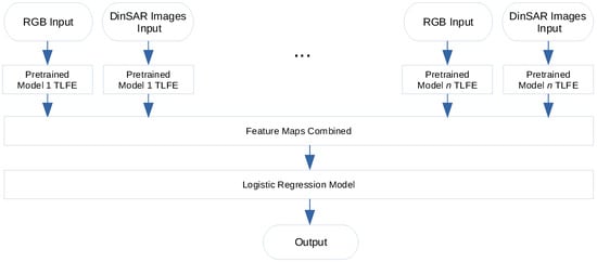 The DInSAR processed images (phase, displacement, and coherence) were scaled to the RGB range from 0 to 255 for all of the models, excluding the non-deep machine learning models, as they used feature descriptors. Mean image subtraction preprocessing was used for the ResNet50 model. For the best performance to be obtained from transfer learning the same input image sizes and preprocessing needed to be performed, as what was performed when the model was trained on the original dataset [,]. Scaling the features to unit variance and zero mean preprocessing was done for the logistic regression models used when doing TLFE. The same scaling was also used for the support vector machines, random forest, and multi-layer perceptron models used in the non-deep machine learning models. This scaling helps to avoid skewing the model and caters for any features that may have a larger scale or variance than the rest of the features [].