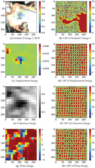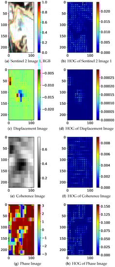 The LBP classifies textures and is commonly used in facial recognition algorithms. It is based on determining whether the points that surround the central point are greater than or less than it, and returning a result that is binary. This can then be converted into an 8-bit number []. The same input image sizes as those used for deep learning and used by ResNet [] (224 × 224) are used for LBP. The two-dimensional uniform LBP is calculated using the following parameters: 24 as the number of points, i.e., eight times the radius, using a radius of three. A normalized histogram of the LBP image is generated. The HOG feature descriptor requires the input images to be resized to a 1:2 aspect ratio. To implement this, the images are resized to 112 × 224 pixels. The parameters of the HOG feature descriptor used are as follows: an 8 × 8-pixel cell window, nine orientations, and 2 × 2 cells per block. The features are also normalized in the LBP space. Both feature descriptors are applied to the phase maps, coherence maps, displacement maps, and the RGB optical image, separately. The feature vector obtained from applying the respective descriptor to each of these images, was also concatenated into a combined feature vector for a combined model. An example of the LBP and HOG feature descriptors applied to a positive blob at the location (−26.2204906351649, 28.0539217476939) are illustrated in Figure 4 and Figure 5, respectively.