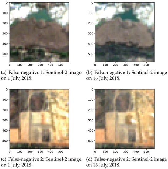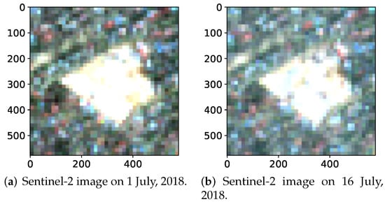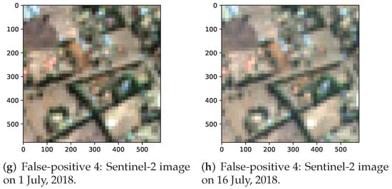 True-positive blobs are blobs where change was detected. Figure 6 shows two Sentinel-2 optical images at a 10 m resolution of an example of a true-positive blob due to construction having occurred at the coordinates (−26.1431583848774, 28.1765660900992) in Germiston, Gauteng, South Africa.