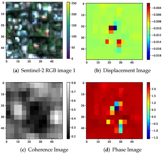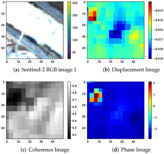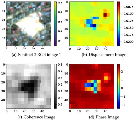 Figure 7 shows the corresponding Google Earth [] image on 27 June 2018, confirming that it is a construction site as the construction of the roof of the building is visible. Figure 8 illustrates the true-positive blob’s corresponding DInSAR processed phase, coherence, and displacement maps with the corresponding Sentinel-2 RGB image.