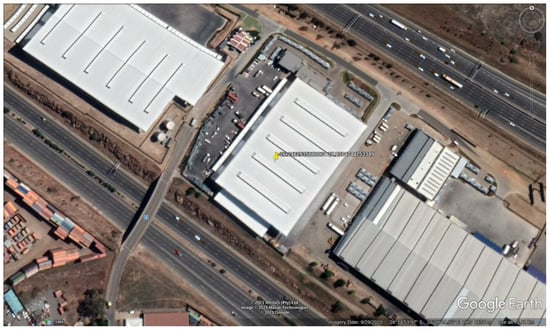 Figure 9 shows the two Sentinel-2 optical images of a true-positive blob with construction at the coordinates (−26.106468326956, 28.1471985770085) in Thornhill Estate, Gauteng, South Africa. Figure 10 shows the corresponding Google Earth [] image in June 2018, confirming that it is a construction site.