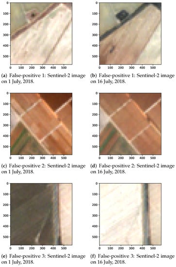 Transfer learning was previously applied to Sentinel-1 SAR and Sentinel-2 optical imagery. For instance, Pomente et al. [] extract deep features from Sentinel-2 imagery acquired at different times using CNNs. A dissimilarity map with change probabilities at a pixel level was then developed by using the Euclidean distance between pixels. The areas where change occurred were indicated by bounding boxes and obtained by applying clustering with an optimizing connected component labeling algorithm. They concluded that the algorithm is effective [].
