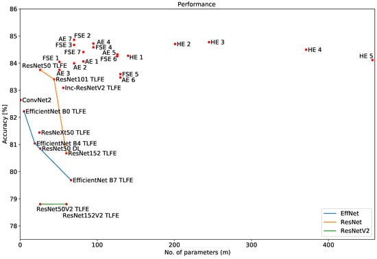 The advent of deep residual networks (ResNet) [] has allowed significantly deeper neural networks to be trained as they overcome the vanishing gradient problem by designing the layers, such that they learn residual functions of the layer inputs as opposed to learning unreferenced functions. This lead to improvements in image recognition accuracy. The ResNet50 has 50 layers, ResNet101 has 101 layers, and so on [,,]. ResNet Version 2 (ResNetV2) [] improved upon ResNet and is based upon a new residual unit that makes training simpler and improves generalization by using identity mappings as the skip connections and after-addition activation to improve accuracy [,,].