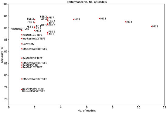 The ensemble of models can improve performance across a number of domains compared to single model performance if weak learners are aggregated by using voting [,,,]. Thus, ensembles of models were also evaluated with transfer learning using features extracted to generate feature maps. We then used Logistic Regression on the feature maps for classification. The average performance accuracy on a hold-out unseen test dataset obtained with ten-fold cross-validation was also measured [,]. Three types of ensembles were used: feature space ensemble of TLFE neural networks, average ensemble of TLFE neural networks, and hybrid ensemble of TLFE neural networks.
