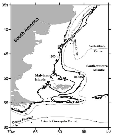 The southwestern Atlantic, located to the southeast of South America, includes a continental shelf to the northwest and a broad Argentine Basin to the southeast. As a part of the Southern Ocean, it is connected to the Pacific and Antarctic through the Drake Passage (Figure 1). Between the subtropical waters and the Antarctic Peninsula, the southwestern Atlantic is characterized by a sequence of currents and associated hydrographical features, including frontal systems. From north to south, the most pronounced currents are the Brazil Current [1], the Malvinas [2,3] or Falkland Current [4], the South Atlantic Current in the Subtropical Convergence [5], and the Antarctic Circumpolar Current (ACC) [6,7,8]. At large scales, the Southern Ocean is characterized by the intense eastward-flowing ACC. Connecting the three oceans in the world, the ACC significantly influences the environment of Antarctica, the transport of materials in the Southern Ocean, and climate change [9,10]. The Falkland Current, as a tributary of the ACC at Cape Horn and the main source of cooling and oceanic materials of open-ocean origin, plays an important role in the transport of material and the regional frontogenesis in the southwestern Atlantic [11].