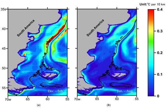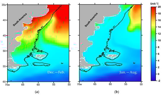 The southwestern Atlantic mainly contains the South American continental shelf water and the Falkland Current, which are bounded by the 200 m isobath. Beyond that, the west side is the high-temperature South American continental shelf waters, while the east side is the low-temperature Falkland Current. Moreover, the Falkland Current invades the shelf waters from south to north. The South American shelf water and the Falkland current water continuously exchange materials along the South American shelf break, an area where the depths range between 200 m and 1000 m isobaths. Therefore, it is easy to produce fronts in the southwestern Atlantic. However, according to the seasonal mean distribution of SST, the SST in the southwestern Atlantic had a significant seasonal variation under the influence of solar radiation and west wind drift. Figure 2 describes the seasonal difference of SST distribution in the southwestern Atlantic. As shown in Figure 2a, in summer, the SST increased gradually from south to north. With the 200 m isobath as an approximate boundary, the temperature on both sides was between 12 °C and 15 °C, and there was an obvious difference in temperature. Since the South American continental shelf waters are influenced by the Brazil Warm Current, the shelf water is warmer than the Falkland Current water. Between these two water masses, it is easy for the fronts to develop. However, due to the weakening of solar radiation and the influence of west wind drift in winter, the increasing sea surface cooling effect in the southwestern Atlantic made the SST uniform (see Figure 2b). With the 200 m isobath as the boundary, the temperature difference between the two sides was less than 2 °C, and the SST difference was small.