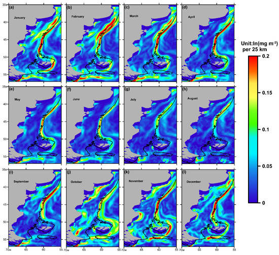 Monthly mean ocean color gradient magnitude maps obtained from MODIS high-resolution CHL data for 2007–2019. (a–l) respectively represent the average gradient magnitude of each month from January to December. The black contours are the 200 m isobaths.