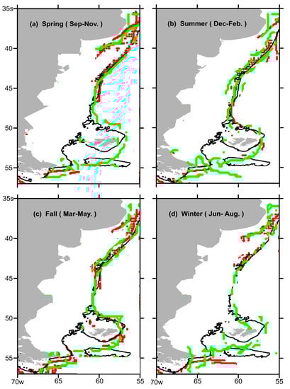Figure 6 shows the seasonal variation of the SOF path in the southwestern Atlantic. Moreover, the path of the Southern Ocean thermal front was compared with that of the Southern Ocean color front.