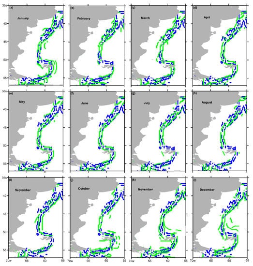 Comparison of the annual mean paths and the monthly mean paths of the Southern Ocean color fronts in the southwestern Atlantic. (a–l) respectively represent the comparison results of the monthly average path and the annual average path from January to December. The blue solid lines represent the annual mean paths, and the green solid lines represent the monthly mean paths.