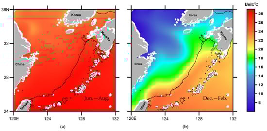 Seasonal mean SST distributions in the East China Sea obtained from RSS high-resolution SST data for 2004–2019: (a) the summer mean SST distribution; (b) the winter mean SST distribution. The solid black contour lines are the 200 m isobaths.