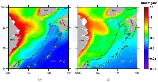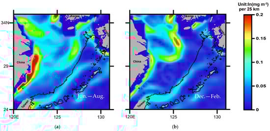 Seasonal mean CHL lognormal distributions in the East China Sea obtained from MODIS high-resolution CHL data for 2007–2019: (a) the summer mean CHL distribution; (b) the winter mean CHL distribution. The solid black contour lines are the 200 m isobaths.