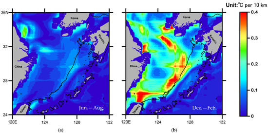 Seasonal mean SST gradient magnitude maps for the East China Sea: (a) the summer mean SST gradient magnitude map; (b) the winter mean SST gradient magnitude map. The black contours delineate the 200 m isobaths.