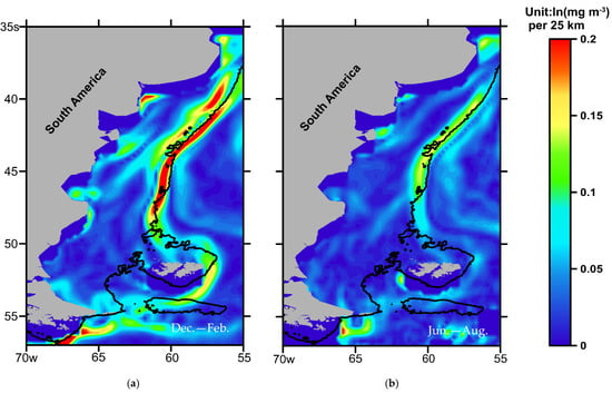 Seasonal mean CHL lognormal distributions over the southwestern Atlantic obtained from MODIS high-resolution CHL data for 2007–2019: (a) the summer mean CHL distribution; (b) the winter mean CHL distribution. The solid black contour lines are 200 m isobaths.