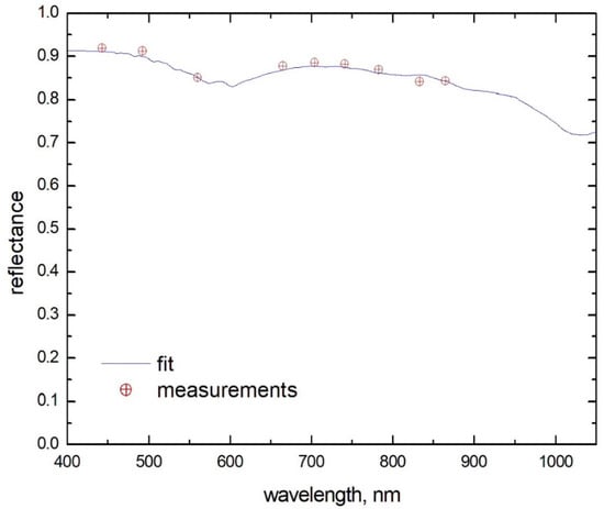 The fit of MSI spectral reflectance over Dome C (Antarctica) (see Equation (4)). The MSI/ S-2 TOA reflectance observations were performed on 3 November 2020 during the ozone hole occurrence [].