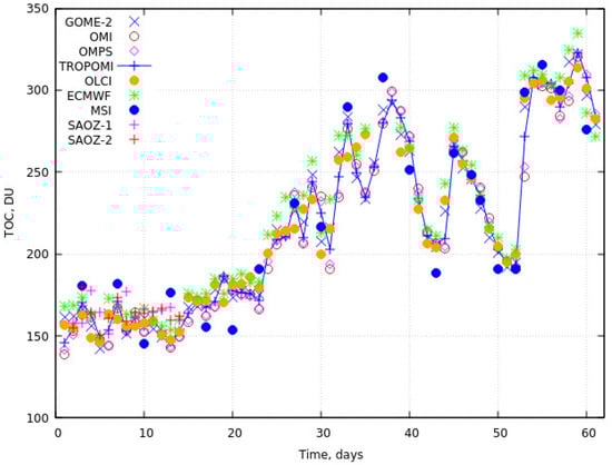 where , is the latitude in degrees (the negative number in the southern hemisphere), is the radius of the Earth, is the height of the ozone layer in . Equation (9) coincides with the geometrical AMF at s = 0. We also show the TOC derived from other satellite/ground observations (see Table 3 and [] for details on various satellite measurements) and European Centre for Medium-Range Weather Forecasts (ECMWF) re-analysis in Figure 2. The temporal (daily product) and spatial 1deg averaging around the site was performed (except for MSI, where data for a given pixel or the average of two pixels (S-2A, S-2B), if available, is given). It follows that all instruments show the existence of the ozone hole in early November and its disappearance in the last week of December 2020. Data from all instruments closely follow all temporal oscillations of the TOC (see, e.g., the TOC wave centered at day 45 (15 December) in Figure 2). There is a temporal/spatial mismatch between MSI/S-2 and other satellite measurements. In particular, the MSI/S-2 measurements provide the total ozone column on the spatial scale of 10 m, which is not possible for other instruments (see Table 1). This could explain some differences seen in TOC derived from MSI as compared to other instruments.