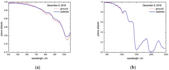 (a,b) The snow spectral plane albedo derived from dual—channel (443 and 865 nm) satellite (blue line) and ground (red) measurements. The measurements were performed on 9 December 2016 at Dome C in Antarctica. The satellite-derived snow albedo is provided on the spectral grid 10 nm. The right panel gives the plane albedo in a broader spectral range not covered by ground measurements.