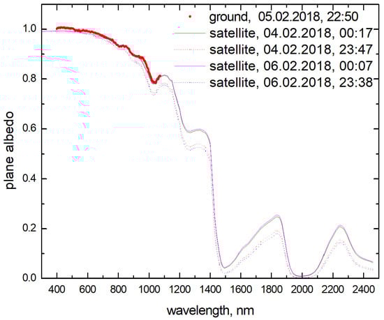 One can conclude from Figure 4 that spectral albedo does not change considerably during 2 days, if measurements are performed at almost the same time of day (say, 4 February (00:17UTC) and 6 February (00:07UTC)). They are close to the ground measurements performed on 5 February (22:50UTC), 1 h 17 min ahead of satellite measurements performed on 6 February (00:07UTC).