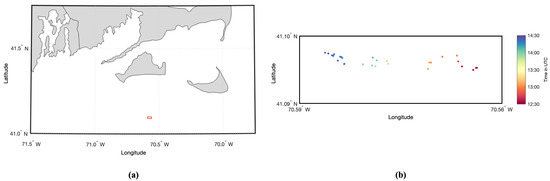 Location of the in situ samples and photographs. (a) Study site relative to the island of Martha’s Vineyard, Massachusetts, USA; (b) Zoom-in on the red rectangle in (a) showing the locations where the drone samples and photographs were taken. The dots are color-coded by time, from red at 12:31 UTC to blue at 14:28 UTC.