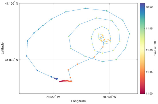 Ship tracks of R/V UCONN showing the spiral pattern of the rhodamine dye release. The dots represent the ship’s locations during the release, between 11:25 and 11:58 UTC, and are color-coded by time.