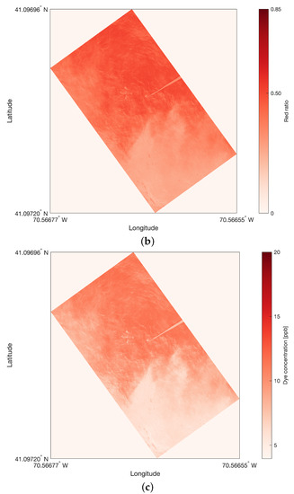 Color decomposition for the altitude image at sample location #5. (a) Raw image. For scale, the drifter had a span of 1.09 m; (b) Heat map of the red ratios: the percentage of red component over total RGB intensities; (c) Heat map of dye concentrations calibrated with the in situ samples.