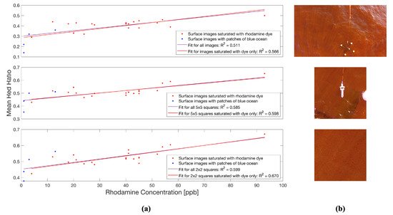 Given that the images were photographed within three hours of the dye release, and given that the dye diffusion is not homogeneous (see [20,25] for additional patterns of dye diffusion in the surrounding coastal ocean), the analysis was re-iterated on subsets of the surface images to look at the correlation between in situ dye concentrations and averaged red ratios over smaller areas. For these additional analyses, the surface images were cropped around their center to capture about 5-in squares of sea surface, then cropped to 2-in squares within these 5-in squares but without capturing the sampler itself. The results are plotted in Figure 5, (Middle) and (Bottom). In both cases, the linear fit was calculated for the set of all images and for the set of images at saturation (no patches of blue ocean). The values increased to 0.598 for the saturated 5 × 5-in squares and to 0.670 for the saturated 2 × 2-in squares.