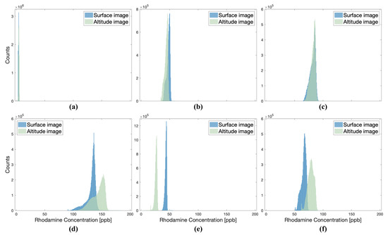 Distributions of calibrated heat maps for selected pairs of surface (blue) and altitude (green) images. The bin widths were 0.5 ppb for all histograms. Top row: locations (a) #4, (b) #11 and (c) #1 had distributions that overlapped quite well, with low, medium and high rhodamine concentrations, respectively. The similarity values were 0.584, 0.450 and 0.823, respectively. Bottom row: distributions for the three pairs that had an object of reference at altitude, locations (d) #2, with a similarity value of 0.432, (e) #16, with a similarity value of 2.53 and (f) #22, with a similarity value of 0.181.