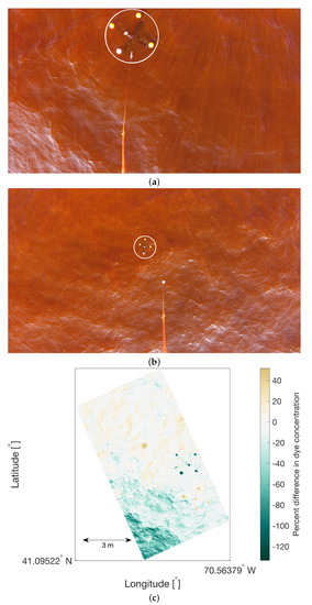 Comparison of dye heat maps between the surface and altitude images at sample location #2; (a) Raw surface image. The 1.09-m drifter, circled in white, was used as altitude reference; (b) Raw altitude image. The 1.09-m drifter, circled in white, was used as altitude reference; (c) Percent difference in rhodamine concentration in ppb between the photographs in (a,b).