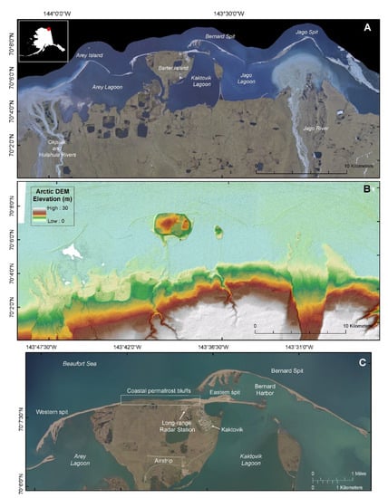 Barter Island is a remnant tundra island that sits between two large deltas of the Jago and Okpilak-Hulahula Rivers. It is one of the largest islands along Alaska’s coast, with a total area of nearly 1600 hectares (six square miles). The geological history of the island is not well known, but surficial coastal plain sediments in the area are thought to be composed of reworked eolian, alluvial, fluvial, and marine deposits of the Quaternary Gubik Formation, covered by a 2–3 m thick layer of late Pleistocene and Holocene peaty/muddy thaw-lake sediment [,,]. Barter Island is anomalously high compared to the surrounding coastal features, reaching up to 16 m high in the central part of the island (Figure 1B). Broad low-lying (<2 m high) sand and gravel spits extend east and west from the topographically higher tundra hinterland (Figure 1C). The community of Kaktovik and adjacent U.S. Air Force radar site sit on the north shore of the island near the eastern end of a nearly 3 km stretch of eroding coastal permafrost bluffs. The bluffs range in height from a few meters to more than ten meters high and consist of a complex sequence of poorly consolidated material ranging from dense clay, interbedded and massive sand and gravel, massive ice, which has been interpreted as buried glacial ice [,,], wedge ice, segregated ice layers, massive ice, and thermokarst cave ice, all capped with a surface peat layer [,,]. Barter Island, like the entire North Slope of Alaska, is in a zone of continuous permafrost, with a shallow active layer (historically generally less than 1 m deep) that is subject to thawing during the summer season. Narrow (<20 m wide) beaches front most of the coastal bluffs. Bernard Spit, a low-lying barrier island to the northeast, protects much of Barter Island’s eastern spit from incident wave energy. The island is subject to overwash and breaching during periods of high waves and elevated water level. There is an apparent absence of ice-bonded permafrost in Kaktovik Lagoon [].