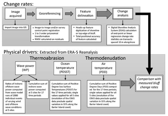 Methodologies used to quantify rates and patterns of landscape change and three potential physical drivers of change are outlined in Figure 2. Shoreline and bluff edge positions were delineated from a combination of historical maps, aerial photography, declassified satellite photography, and very-high resolution satellite imagery spanning a 73 year period between 1947 and 2020. Spatial resolution of the datasets ranges from 0.08 to 4.1 m (Table 1). Shoreline data comprise 21 individual years spanning 1947 to 2020; however, there are only 6 years with complete shoreline coverage over the study area. Bluff edge data comprise 22 individual years ranging from 1950 to 2020. A useable bluff edge position could not be determined from the 1947 nor 1987 T-sheet data. Images were georeferenced and rectified using map coordinates, ground survey points, and/or image-to-image correlation of photo-identifiable ground features. A total root mean square rectification error was determined for each image based on the residuals. The top edge of the bluff and the instantaneous land–water shoreline were manually digitized in a GIS, and a total position uncertainty of the feature was determined as the quadrature sum of all uncertainties, including image resolution, georeferencing/rectification, and feature digitization [] (Table 1).