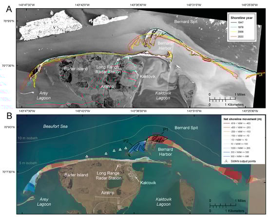 (A) Color-coded shoreline positions for 4 selected historical time periods, overlain on 1955 imagery. Note the formation of the inlet on the eastern Bernard Spit and the southerly retreat and westward extension of both Bernard Spit and western Barter Island between 1947 (black line) and 2020 (red line). Imagery base from USGS Earth Explorer. (B) Net shoreline movement of Barter Island and Bernard Spit between 1947 and 2020 overlain on 2020 imagery. The lengths of the colored lines show the total distance the shoreline moved over the study period. Red lines indicate retreat and blue lines progradation. The area eroded on western Bernard Spit (P1) is nearly equal to the area deposited in P2. Isobaths represent circa 2011 bathymetry []. Imagery base is Alaska High Resolution Imagery (https://gis.data.alaska.gov/pages/Imagery%20Program accessed on 1 October 2021).