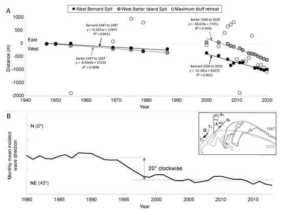 (A) Plot showing the cumulative distance of westward migration of the west end of Bernard Spit, the western Barter Island spit, and the transect of maximum bluff retreat from 1947 (spits) or 1950 (bluffs) and 2020. Simple linear regression equations and R2 values are plotted for two behaviorally similar time periods as observed on the spits: 1947–1987 and 2000–2020; (B) Plot of the change in monthly mean incident wave direction at the ERA5 grid cell ~30 km offshore and in 20 m water depth between 1980 and 2019, showing a 20 degree clockwise rotation. Inset plot shows these angles in relation to Bernard Spit.
